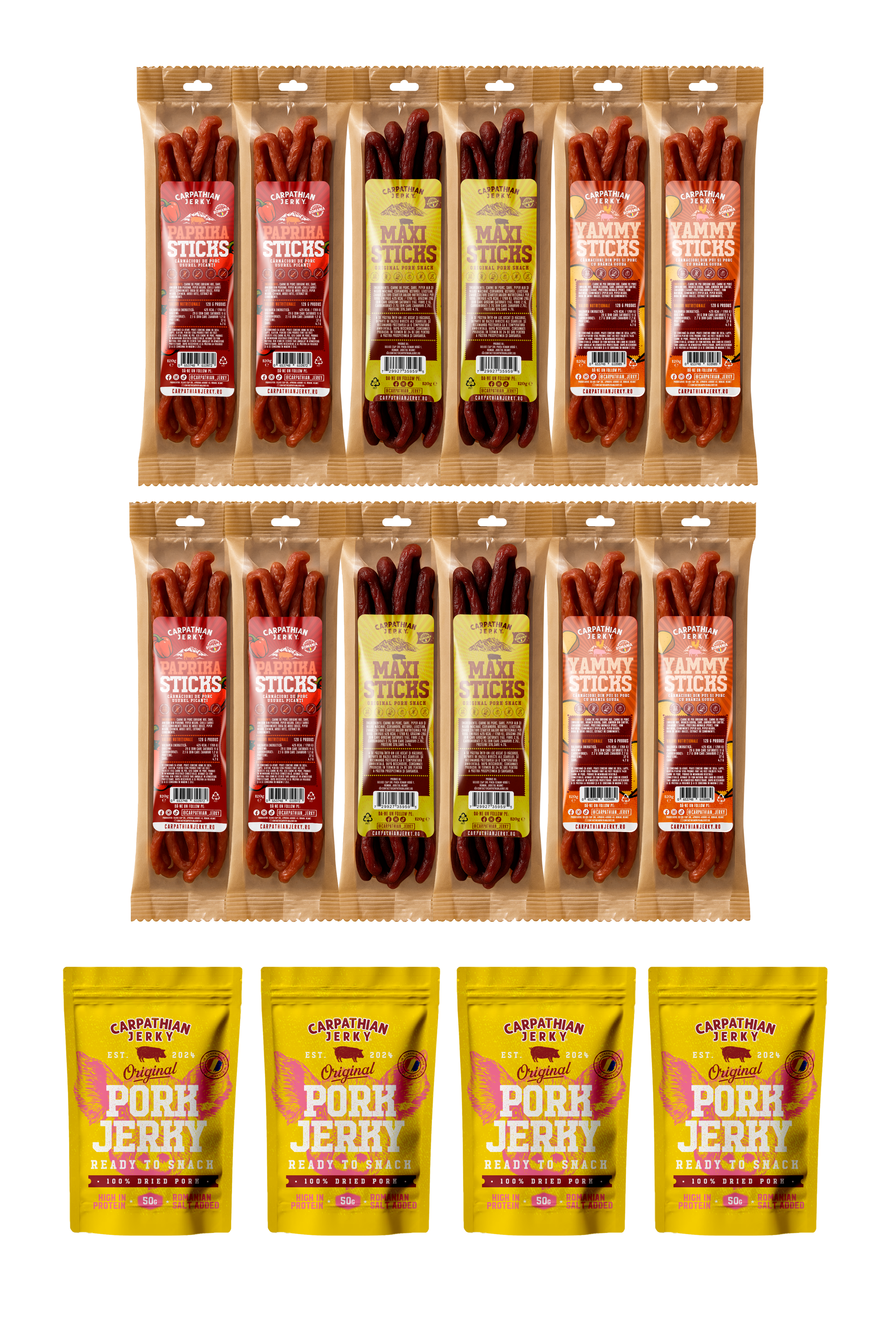 Karpaten-Jerky ist das erste 100 % rumänische Trockenfleisch, das Abenteurern den authentischen Geschmack unseres Terroirs bietet. Das Beef Jerky bietet eine knusprige Textur, während das Chicken Jerky weicher ist und sich perfekt für unterschiedliche Vorlieben eignet.